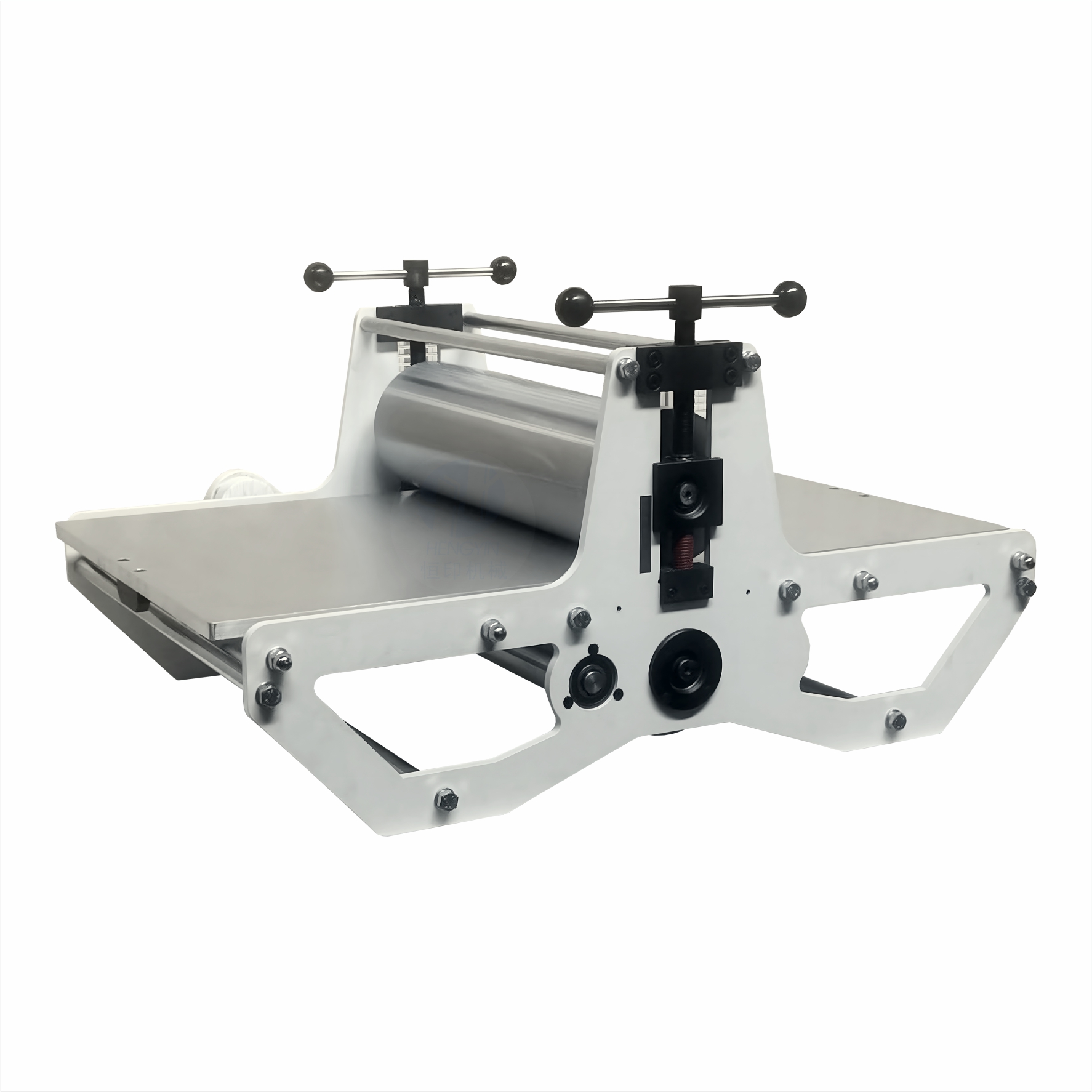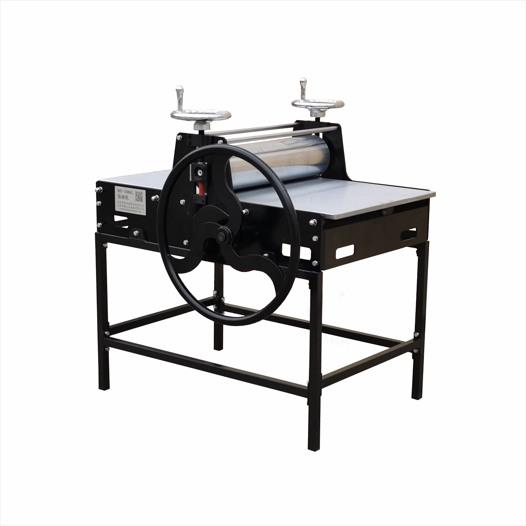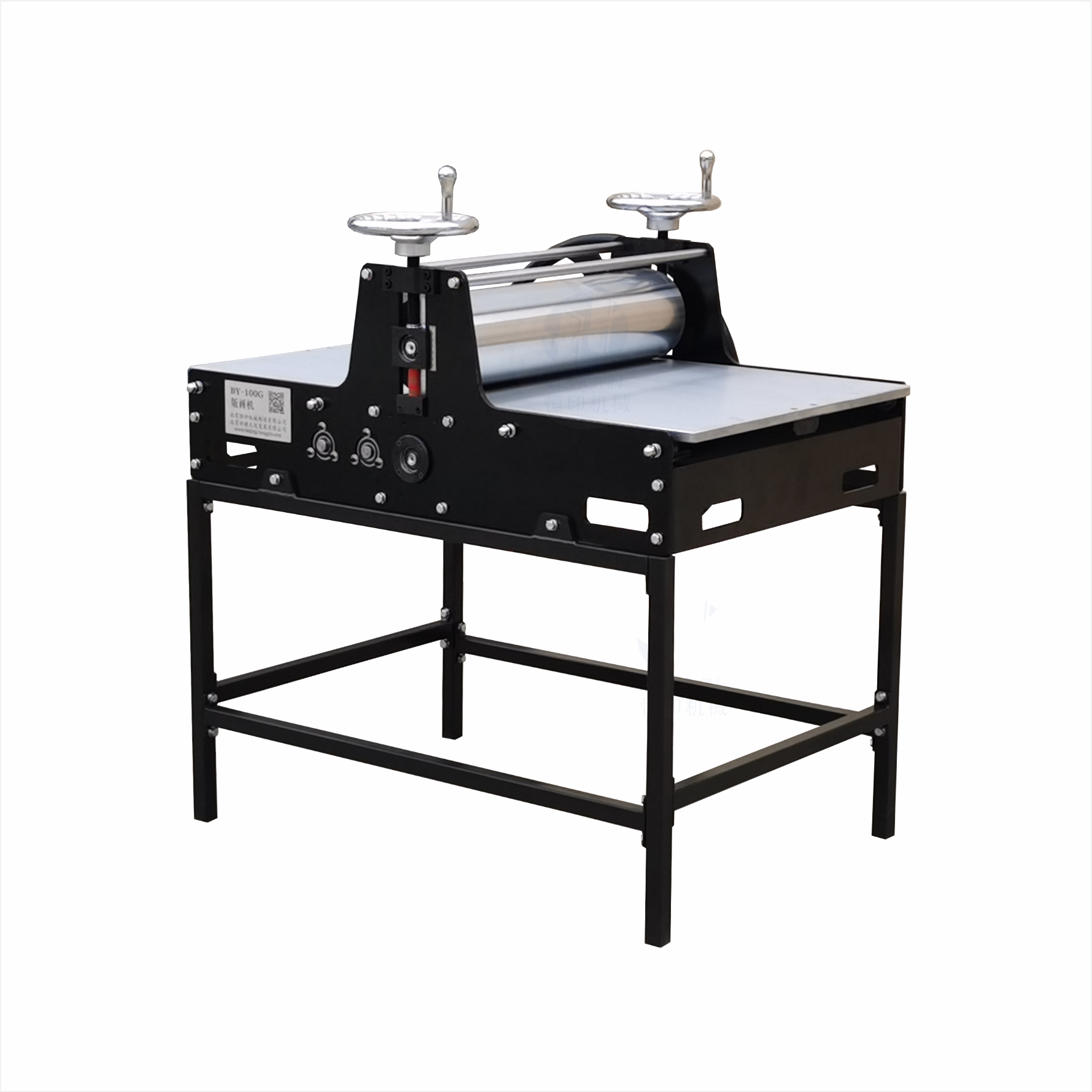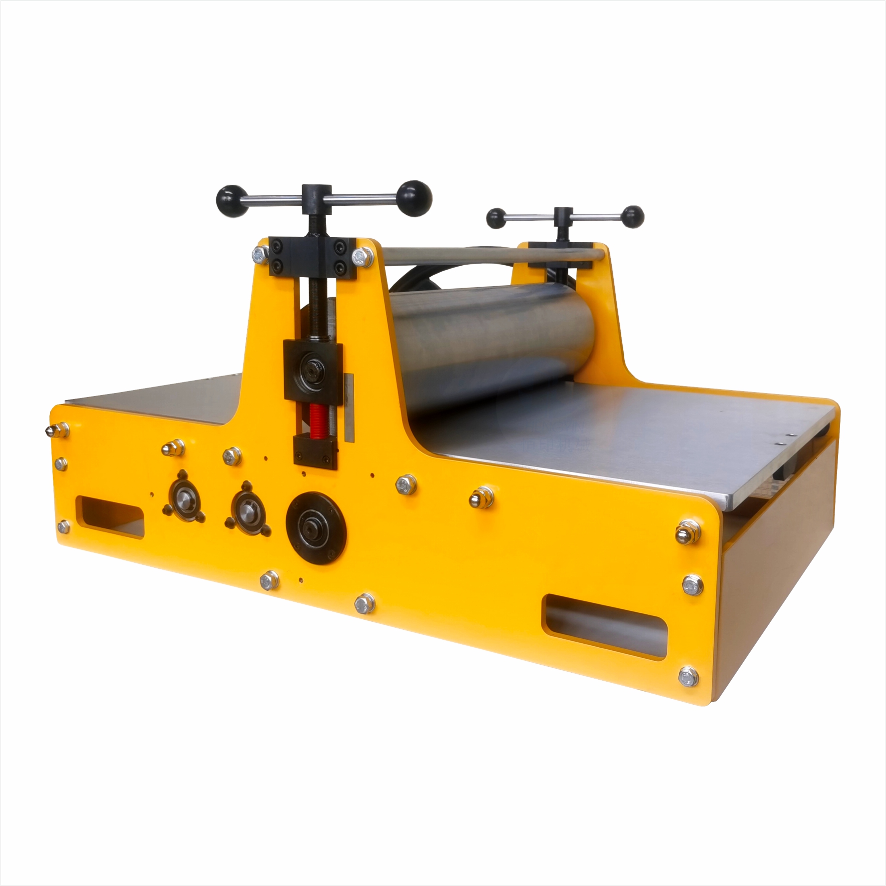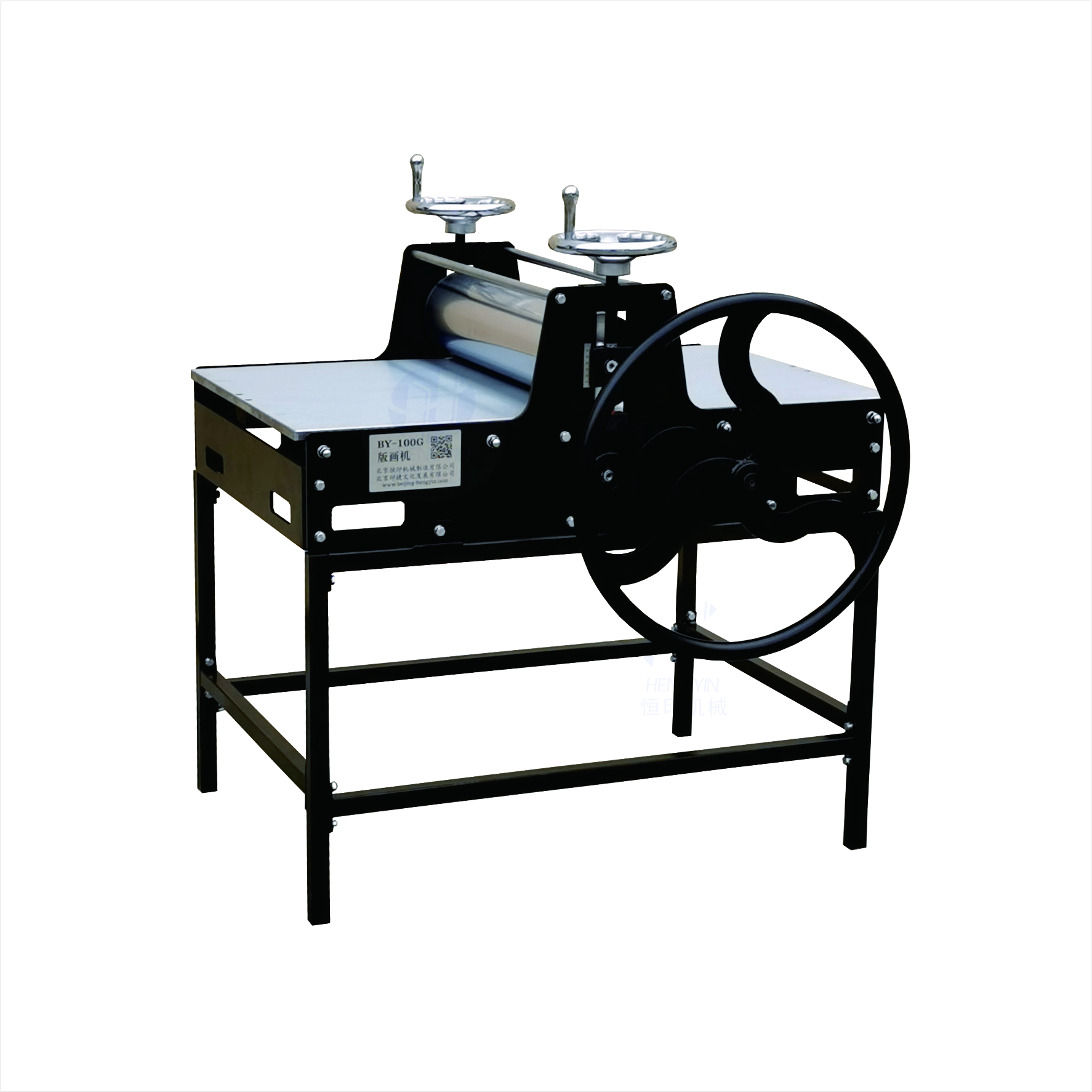 | BY-100G 版畫機 高強度專業級版畫機,適用于木版、銅版、綜合材料版等多類別印版的版畫印制。 ● 版床:采用17mm厚度高強度鋼制版床,精磨鍍鉻。 ● 壓印上滾筒:高強度厚壁鋼管鍍鉻。 ● 壓印下滾筒:高強度厚壁鋼管滾花鍍鉻。 ● 主結構:主機墻板一體化高強度鋼板由CNC數控加工中心加工,整體結構設計。墻板表面采用靜電噴涂處理。 ● 減速裝置:采用大減速比高精度齒輪傳動,二級減速齒輪變速箱,結構緊湊,壓印力大,傳動效率、穩定性和長壽命,避免了鏈條傳動易磨損、易伸長、運行平 穩性差、間隙大定位不準易出墨杠等弊病。 ● 安全設計:減速箱封閉設計,齒輪不外露,操作使用符合安全規范。 ● 機器運行兩端均設有限位裝置,防止版床在使用時脫離。 ● 壓力標尺刻度標識設計,壓力精準,壓力大小調節一目了然。 ● 采用大尺寸滾輪式手輪,運行平穩,使用方便。 |