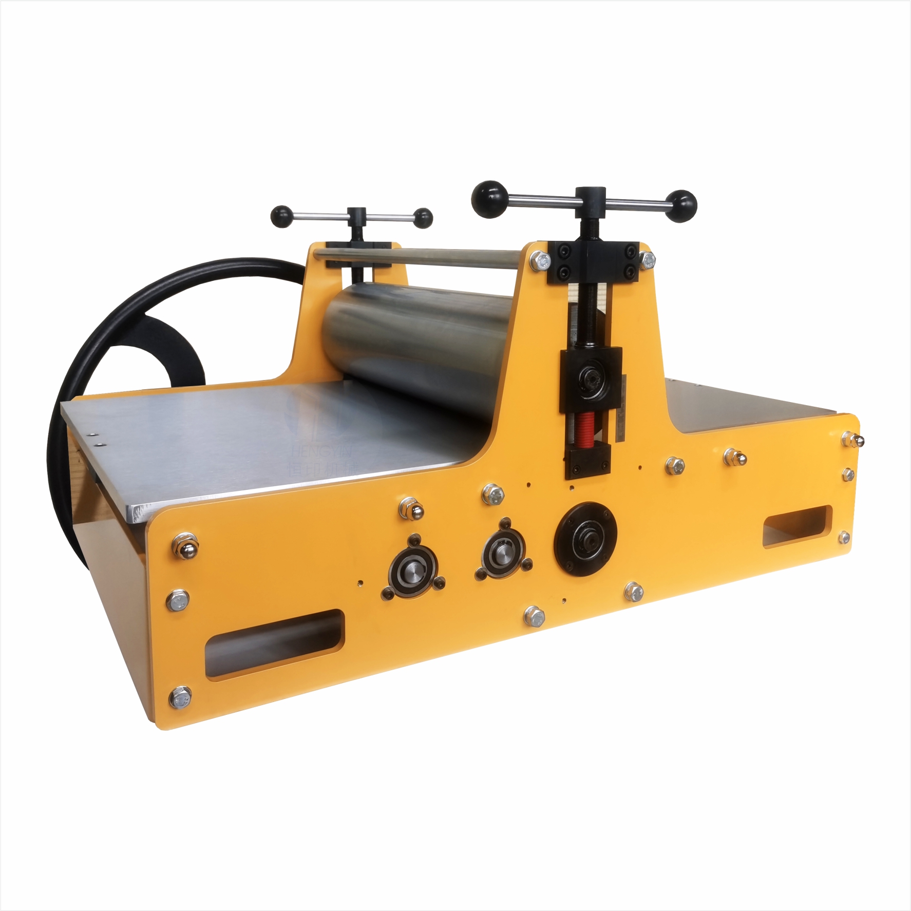 | BY-80G 版畫機 適用于木版、銅版、綜合材料版,桌面型設計(可選底架)。 ● 版床:采用14mm厚度高強度鋼制版床,精磨鍍鉻。 ● 壓印上滾筒:高強度厚壁鋼管鍍鉻。 ● 壓印下滾筒:高強度厚壁鋼管滾花鍍鉻。 ● 主結構:主機墻板一體化高強度鋼板由CNC數控加工中心加工,整體結構設計。墻板表面采用靜電噴涂處理。 ● 減速裝置:采用大減速比高精度齒輪傳動,結構緊湊,壓印力大,傳動效率、穩定性和長壽命,避免了鏈條傳動易磨損、易伸長、運行平穩性差、間隙大定位不準易出墨杠等弊病。 ● 安全設計:減速箱封閉設計,齒輪不外露,操作使用符合安全規范。 ● 機器運行兩端均設有限位裝置,防止版床在使用時脫離。 ● 壓力標尺刻度標識設計,壓力精準,壓力大小調節一目了然。 ● 采用大尺寸滾輪式手輪,以人為本的設計理念,符合人體工程學,使用方便。 |