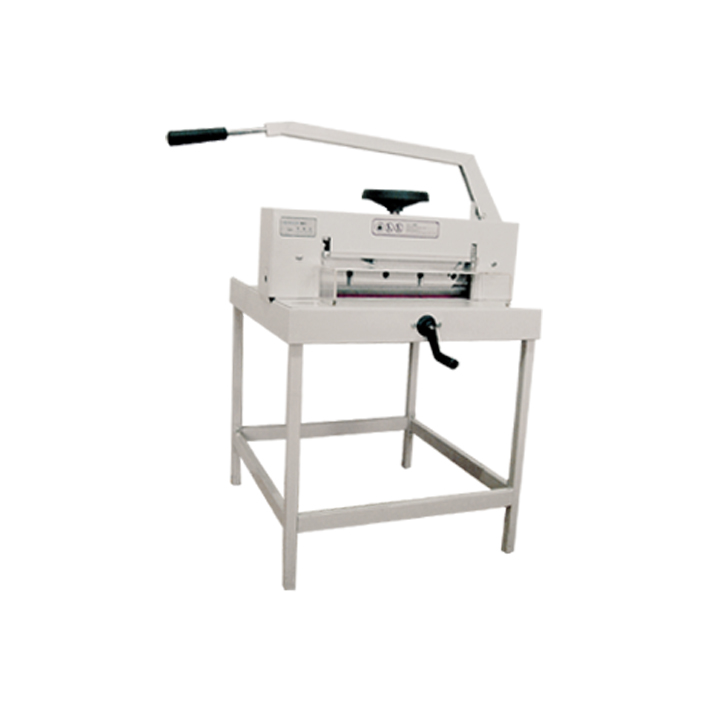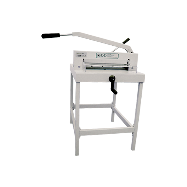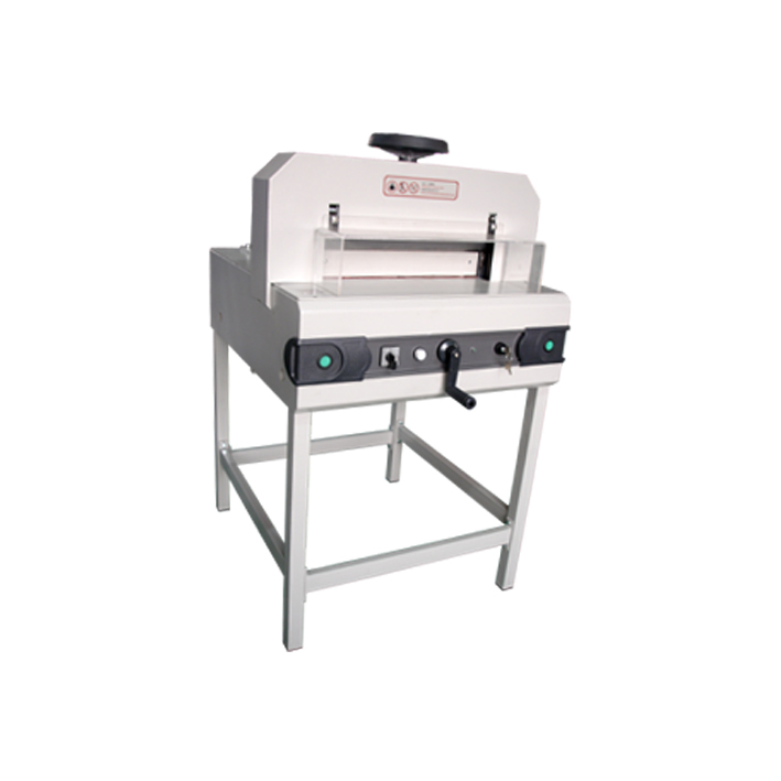 電動切紙,輪盤螺旋式壓紙千斤,裁切光道指示,裁切尺寸側(cè)邊定位標(biāo)尺,手動微調(diào)校準(zhǔn)。